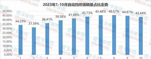 今年10月,自动挡皮卡的终端狭义销量为10046辆,而手动挡销量为13084,自动挡占比为43.44%。自动挡销量占比自今年5月突破40%以后,一直在高位运行。与去年同期相比,10月自动挡皮卡销量增长高达55.27%。1-10月自动挡皮卡销量同比增长40.03%。