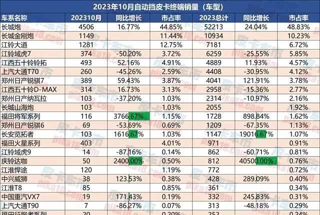 江铃皮卡自动挡销量10月份增长高达94.07%!江铃皮卡自动挡车型10月市占率为16.61%,而全部车型10月份市占率则为16.25%。这说明江铃皮卡终于也销售了更多的自动挡车型。江铃大道的上市让江铃皮卡销售越来越多的自动挡车型,新车型升级明显。