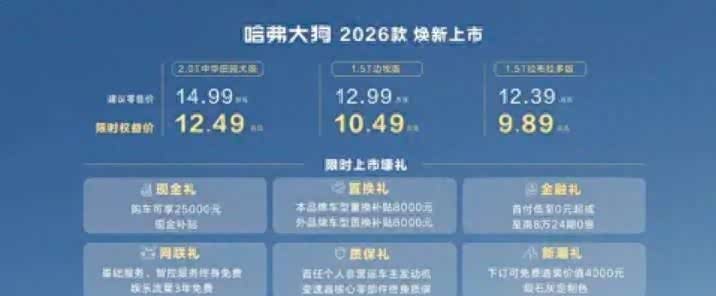 如果你正在寻找一款既能满足城市通勤需求,又能偶尔带你去野外撒欢的SUV,那么2026款哈弗大狗绝对值得你多看几眼。这款车自2020年上市以来,已经累计销售超过60万辆,连续42个月蝉联“方盒子”品类销量冠军,实力不容小觑。而这次2026款的升级,更是从外观到内饰,从智能到动力,全方位提升了产品力,关键是价格还非常亲民,限时权益价仅需9.89万元起,性价比直接拉满。