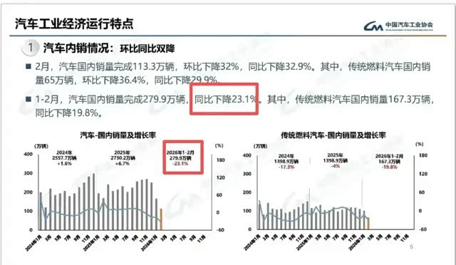 当然,今年2月有一个春节假期因素,但1-2月是有参考性的,根据中国汽车工业协会的信息,汽车国内销量完成279.9万辆,同比下降23.1%。