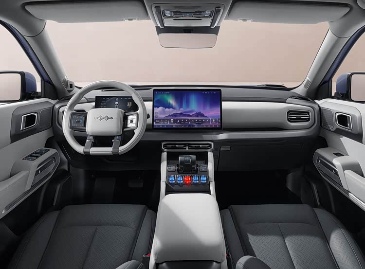 内饰方面也没有变化,提供有三幅式多功能方向盘、悬浮式全液晶仪表盘、悬浮式中控屏以及电子档把,操作台部分配备有无线充电面板以及实体按键,风格显得足够硬朗,HUD抬头显示也没有缺席。