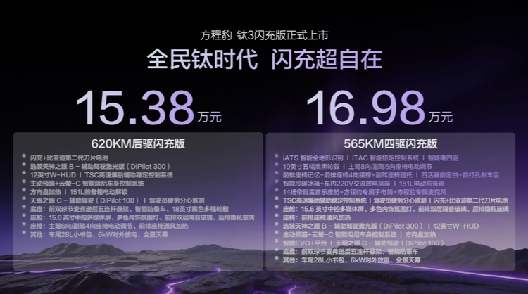 方程豹钛3闪充版的上市,不仅是比亚迪将高端闪充技术下放至主流价位段的重要一步,也标志着纯电动车在补能效率和实用便利性上迈入了全新阶段。对于追求个性、注重科技体验,同时又受困于续航和充电焦虑的年轻消费者而言,这款集硬派设计、超快补能、长续航和智能科技于一身的车型,无疑提供了一个极具竞争力的新选择。