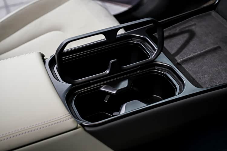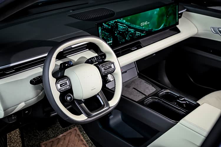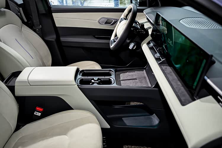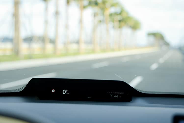 前风挡下方的黑色区域就是仪表盘了,行车信息直接投射在上面,高对比度设计,强光刺眼或下雪天行车时也能看的清楚。换挡杆在方向盘的右下方,方向盘后方的减速拨片用于调节能量回收等级,长按就会激活单踏板模式。