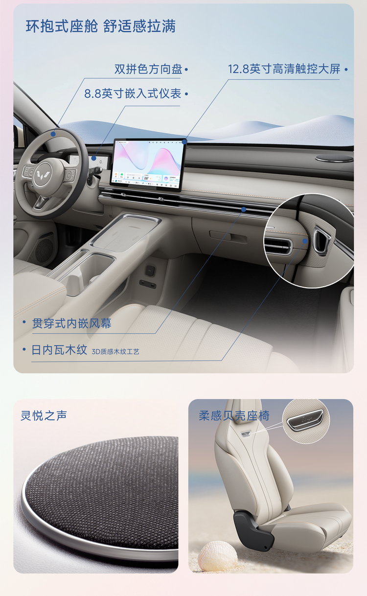 车内的柔感贝壳座椅采用人体工程学曲线设计+双硬度沙发海绵材质,支撑有力的同时给予温柔承托,触感也更加细腻舒适。另外,主驾 6 向电动调节以及前排座椅加热功能,进一步提升了驾乘舒适性。