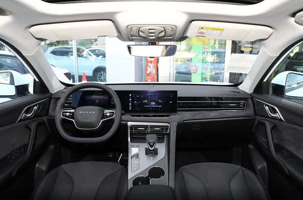 拉开车门,进入荣威D5X DMH的座舱,大面积的绒面材质包覆其中,触感尚可,简洁的中控台上方配有12.3英寸双联屏,除入门版之外,其余型号均搭载斑马智行车载系统,简洁而炫酷的画面有效提升座舱智能化,常规的GPS导航、车联网等实用性配置均没有缺席,基本贴合人们的使用需求。下方还保留了空调、车机调节等物理按键,盲操性还是很不错的,双辐式多功能方向盘支持四向调节,兼顾到不同身材的消费者,皮质方向盘带打孔设计,吸汗能力较强。