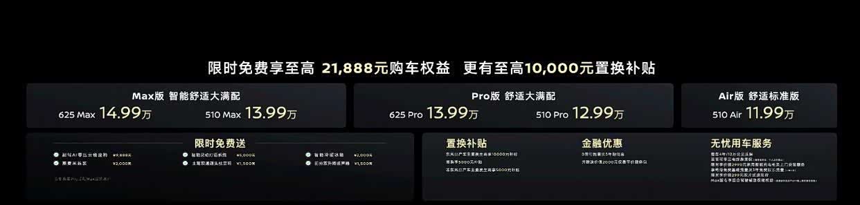 N7推出了Max、Pro、Air三个版本覆盖市场其中顶配的625 Max版以14.99万元价格提供行业领先的8295P芯片、端到端组合驾驶辅助系统及多项首创技术,将智能舒适配置下探至14万级市场;入门款510 Air版则以11.99万起售,通过全域智能防晕车技术实现基础体验的全面保障。