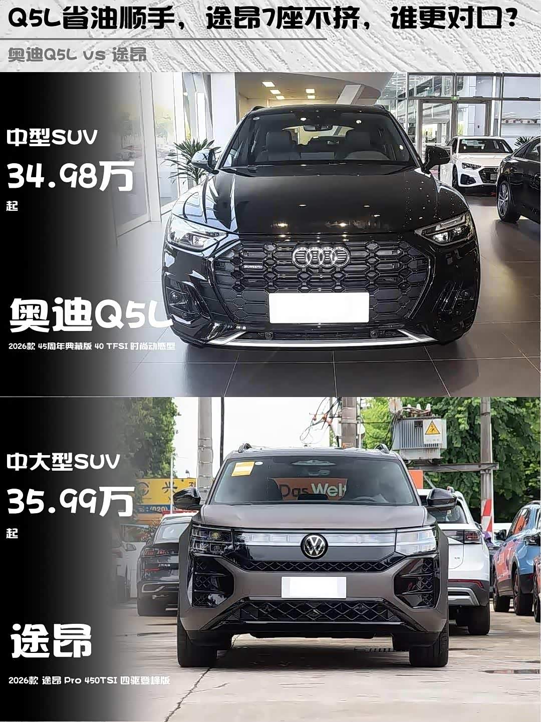 价格方面Q5L典藏版34.98万,终端能砍到29万左右;途昂Pro 35.99万配置更顶。要我说,经常5人以下出行选Q5L,机械素质保值率都在线;要是二胎家庭或爱长途自驾,途昂的大空间真能救命!
