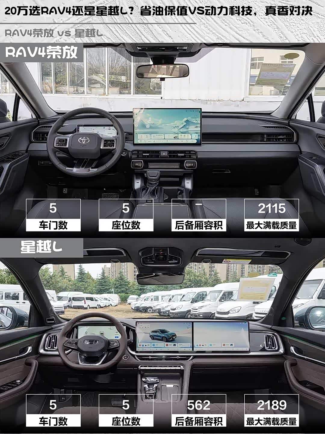 RAV4荣放4620mm车长配580L后备箱,后排纯平地台坐三人无压力;星越L虽然车身4795mm更长,562L后备箱反而略小,但2845mm轴距带来的后排腿部空间确实奢侈!两车都带全景天窗,RAV4的丛林绿车色超适合户外露营🏕️,星越L的东方青配色则更有国潮范儿。