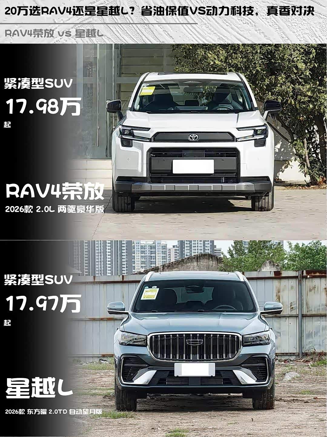 最近在选20万级SUV的朋友看过来! RAV4荣放(参数|询价)和星越L这对老对手2026款又杠上了,今天深度对比两车顶配版,看完你就知道该pick谁了!🔥