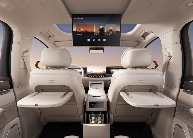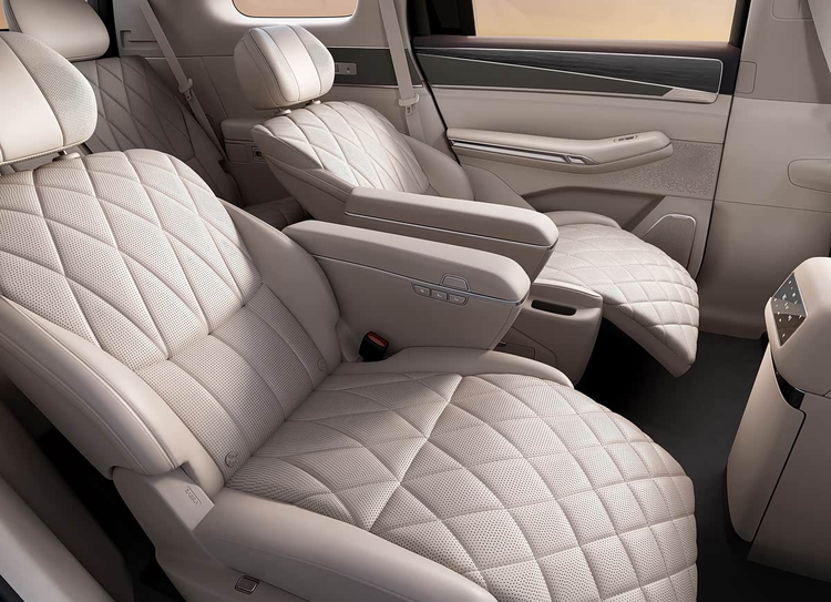 根据已披露的信息,新车内饰将采用全新的多屏布局,包括全液晶仪表、悬浮式中控屏以及一块副驾驶娱乐屏,此外,车辆还提供了抬头显示系统和一套拥有27个扬声器的帝瓦雷品牌音响。座椅采用2+2+3的7座布局,其中第二排为两个独立座椅,配备了一体式腿托,并支持一键放倒至躺姿。座椅表面的菱形缝线意在提升质感。第二排还提供了折叠屏幕、小桌板及车载冰箱。第三排座椅也具备电动调节和加热功能。