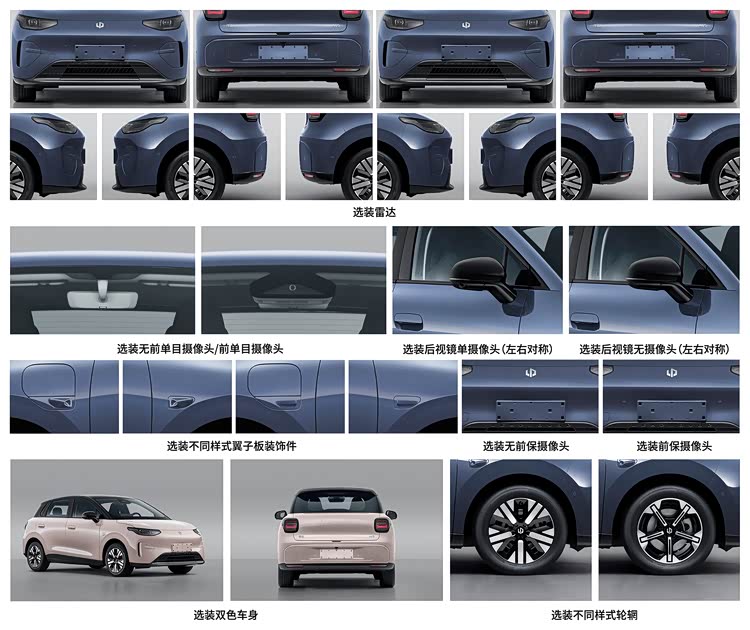 另外采用了黑色B、C柱设计,也没有D柱的小窗,直接是黑色塑料覆盖件,形成悬浮式车顶。还会提供双色车身的选择,并且申报的车型还有粉色,很懂女生的喜好。