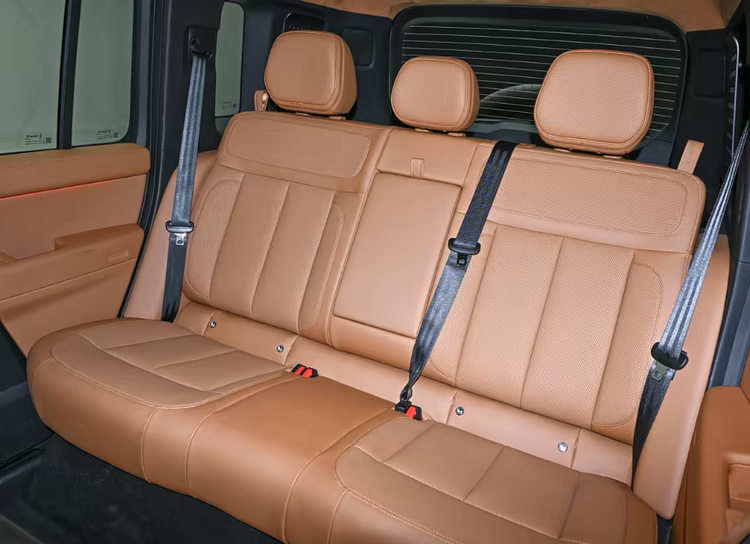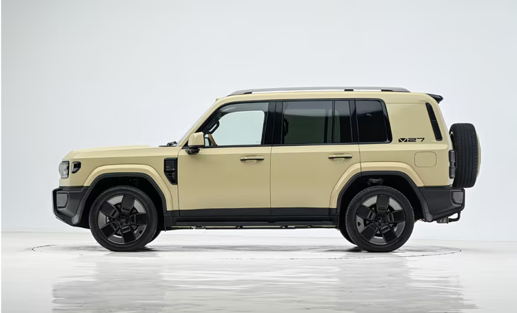 车身侧面线条平直硬朗,车尾保留了外挂式备胎(“小书包”)和竖条状尾灯的经典设计。尺寸方面为长5055mm,宽1976mm、高1894mm,并且轴距达到2910mm,在搭配上21英寸轮圈的情况下,给人以很强的体量感。接近角和离去角均为24. 5°,最小离地间隙为220mm ,最大涉水深度达600mm 。保证了其较好的通过性和越野能力的同时也提升了车辆的安全性。