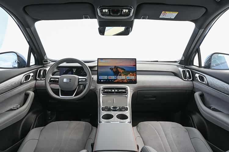 内饰方面,吉利银河M7内饰采用大面积软包材质,搭配生态木纹饰板与水晶组件,采用双色搭配,使用三辐式多功能方向盘、悬浮式中控屏、全液晶仪表,配备全景天窗。