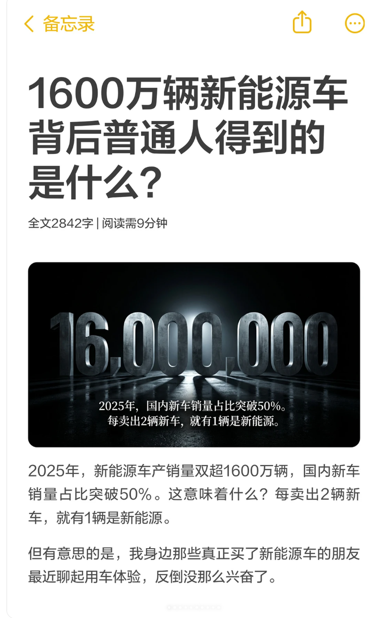 产业的发展终究要落地到每一个普通消费者的用车体验上,1600 万辆的里程碑,证明了新能源汽车的市场认可度,却也暴露了行业发展中的诸多问题:价格体系的不稳定、续航体验的落差、充电基础设施的不均衡、二手市场的不完善。而对于普通人而言,买车从来都不是单纯看产业数据,而是一场综合的权衡:结合自己的预算、日常用车场景、充电条件、换车周期,以及家庭的实际需求,做出最适合自己的选择。新能源汽车是未来的趋势,但当下的所有纠结与困境,都是产业发展过程中必须经历的阶段,而唯有解决好普通人的这些痛点,新能源汽车的普及才能走得更稳、更远。