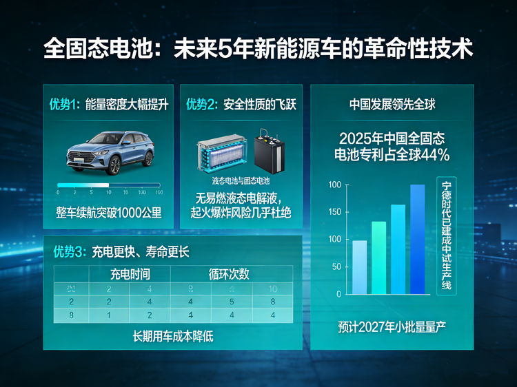 目前,中国在全固态电池领域的发展速度全球领先,2025年新公开专利数量占全球44%,宁德时代等头部企业已经建成中试生产线,预计2027年将实现小批量量产。也就是说,未来5年,我们就能买到搭载全固态电池的新能源车,彻底告别液态电池的烦恼。