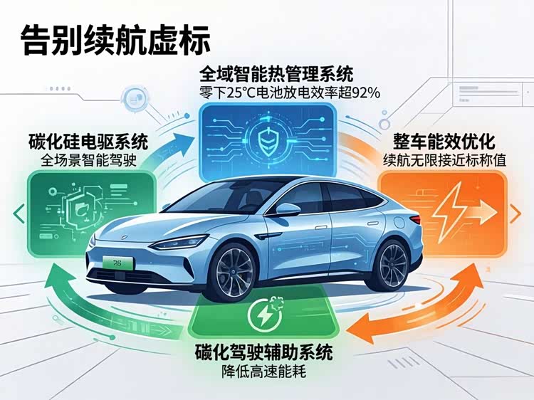 比如,通过先进的全域智能热管理系统,让电池在零下25℃的极端环境下,放电效率依然能超过92%;通过优化碳化硅电驱系统,降低高速行驶时的能耗损耗。以后不管是冬天通勤,还是高速长途,新能源车的实际续航都能无限接近标称值,彻底告别“续航虚标”的烦恼,开电车更安心。