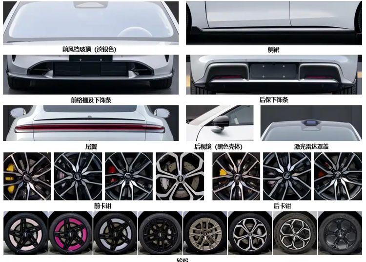 在申报的细节方面,我们可以看到尚界Z7有多种风格的车轮毂可选择,全是年轻消费者喜欢的类型,它还有采用涂装的轮毂边框可选择,很有青春活力感。尚界Z7和尚界Z7T的尺寸是一样的,长宽高均为5036(5051)/1976(1980)/1465(1445)mm,轴距为3000mm,和小米SU7处于同一水平。动力上,新车有单电机版和双电机版可选择,其中单电机版搭载的是264千瓦电机,双电机版搭载的是前170千瓦和后264千瓦电机。