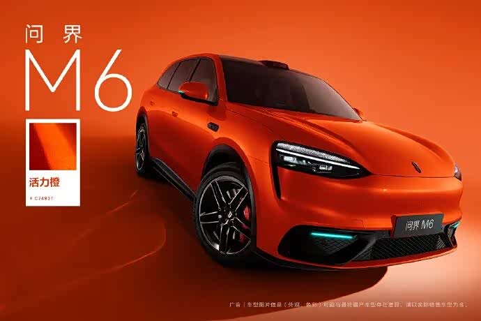 外观设计方面,新车采用问界家族化设计风格,整体造型更年轻更动感。前脸运用封闭式格栅搭配两侧造型狭长的大灯组设计,灯组边缘加入了纵状的导流槽布局,点亮后拥有极高的辨识度。前包围采用三段式进气口,搭配较为运动的前保险杠造型,营造出不错的运动属性。车身侧面,新车采用传统SUV造型设计,车身线条平直舒展,车顶配备激光雷达,搭配半隐藏式门把手、五辐花瓣式轮圈以及红色刹车卡钳罩设计。车身颜色方面,新车提供活力橙、流光青、昼夜紫、钛空银、脉冲蓝、暖云白、曜石黑共计七种车身颜色供消费者选择。尺寸方面,新车长宽高分别为4960/1985/1736mm,轴距为2950mm。车尾部分,新车尾灯采用贯穿式大灯组设计,灯组中间镶嵌可发光的品牌LOGO,搭配尺寸颇大的扰流板以及黑色防擦护板,并带有小蓝灯,整体视觉效果上非常和谐。
