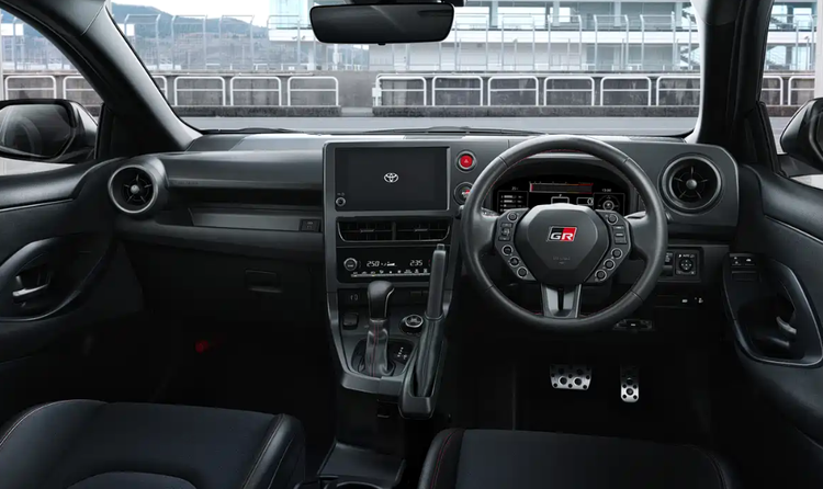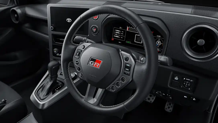 内饰部分,官图揭示核心升级集中在操控相关细节。新车换装全新GR赛车式方向盘,直径缩小且优化握感,功能按键向中心收拢,避免激烈驾驶时误触,按键外围配有环形照明灯,适配暗光环境操作,方向盘中央替换为GR专属徽标。车内依旧采用翻毛皮、运动织物与硬质塑料的组合,兼顾轻量化与运动氛围,同时新增方向盘加热、前排座椅加热等舒适配置,提升日常使用体验。