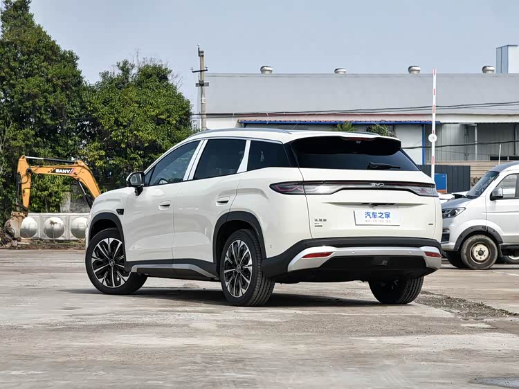 再来看车身侧面部分,宋Ultra EV的长宽高分别为4850/1910/1670mm,轴距达到2840mm,标准的中型SUV身材带来了宽敞的内部空间。半隐藏式门把手与悬浮车顶设计,不仅降低了风阻,还强化了整车的运动感与科技感。前后轮拱上方的内凹筋线,为车身营造出强烈的肌肉感,溜背式的造型设计则让侧面线条更加流畅舒展。