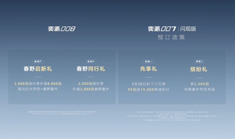 其中,奕派008带来极光红外饰+春野套件,新用户限时2888元享,老用户限时2000元限时享春野套件;