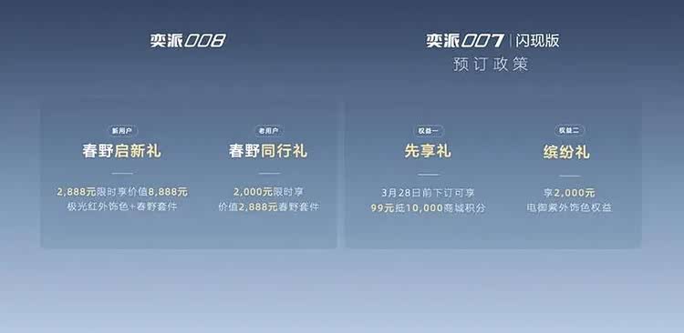 奕派008“极光红”全新车色由东风奕派与用户共创,并携手中国国家地理将阿勒泰红色极光复刻于车身,车漆质感通透且抗刮耐磨。以车顶横杆行李架+固定侧踏板+放电插排为组合的“春野套件”,全场景适配城市露营与户外穿越,解锁更自由的探索生活。为回馈新老用户支持,推出限时购车权益,新用户下订极光红外饰色绑定春野套件限时先享价2888元;老用户可在APP下订春野套件,限时回馈价2000元。