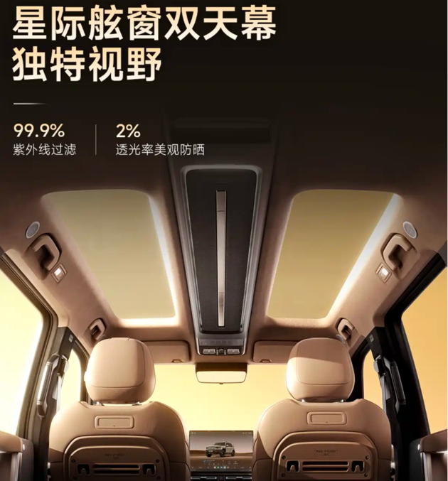 最引人注目的当属首创的星际舷窗双天幕——夹层玻璃可过滤99.9%紫外线,透光率仅2%,既保证了通透的视野,又避免了暴晒困扰。“天空岛”顶棚内嵌周圈漫反射氛围灯,光线柔和且富有层次感,营造出类似星舰座舱的沉浸式氛围。顶棚预留了1/4英寸标准接口,方便用户后期拓展支架、户外设备等,细节处体现对户外玩家的考量。