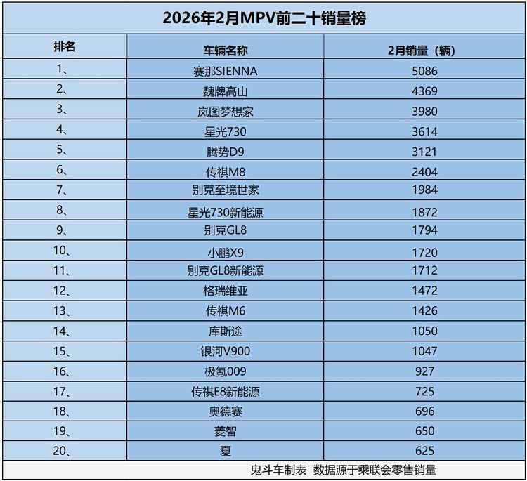 为了让网友们看到的更清楚,鬼哥根据乘联会零售销量数据,整理出2月MPV市场零售销量前二十榜单,结果发现,榜单上,没有一款MPV车型销量破万,仅有一款MPV车型销量突破5000辆,真的是一片惨淡。接下来,我们聊一聊具体的车型排名与销量表现?