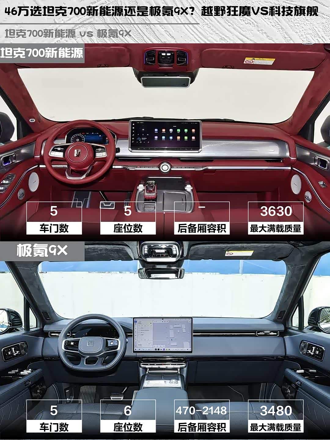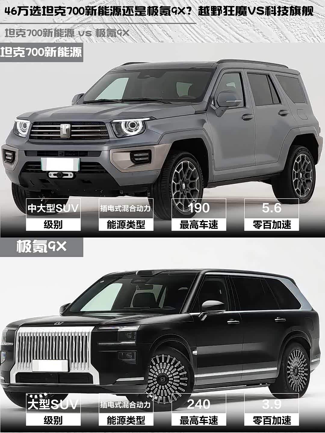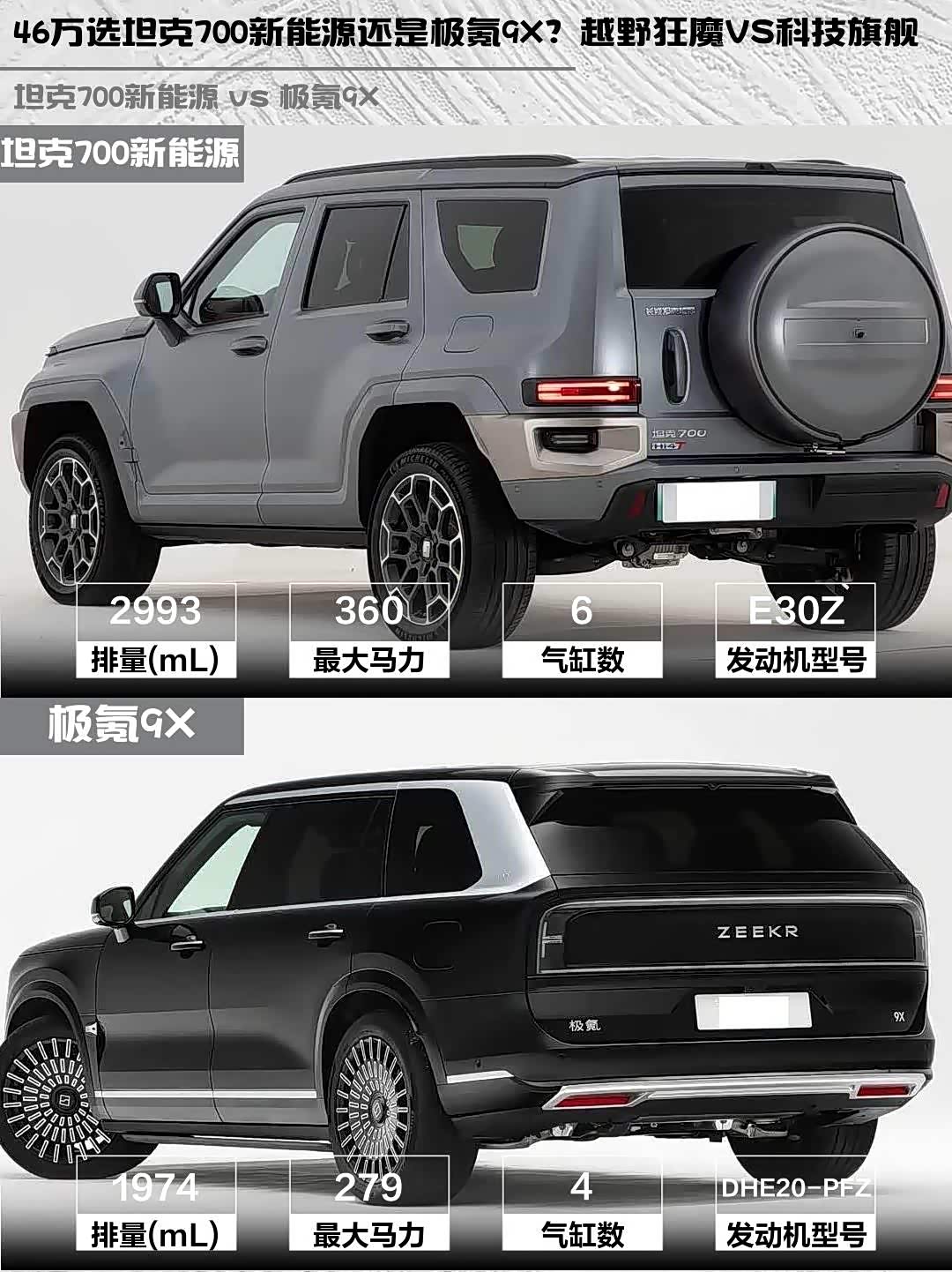 两款车各有千秋,坦克700新能源是越野老炮的终极玩具,极氪9X则是科技控的豪华座驾。你会选哪款?