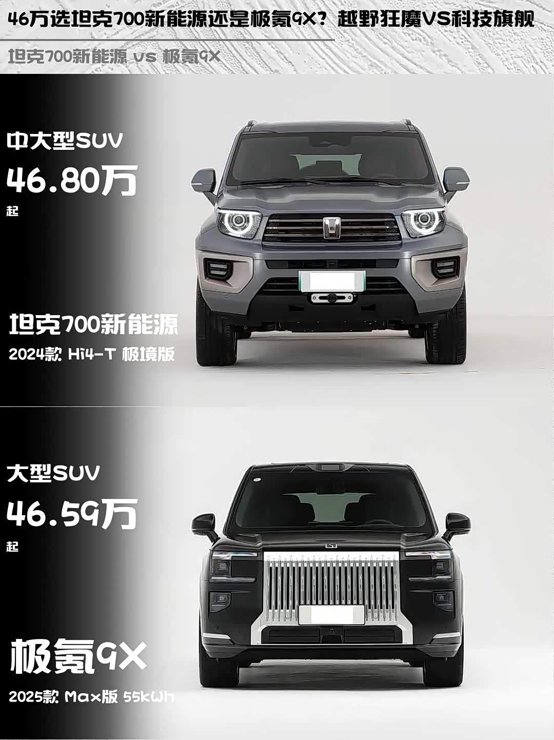 最近试驾了两款超火的豪华SUV—— 坦克700新能源(参数|询价) 2024款 Hi4-T 极境版和极氪9X 2025款 Max版 55kWh,两款车价格都在46万左右,但风格完全不同!分享一下我的真实感受👇
