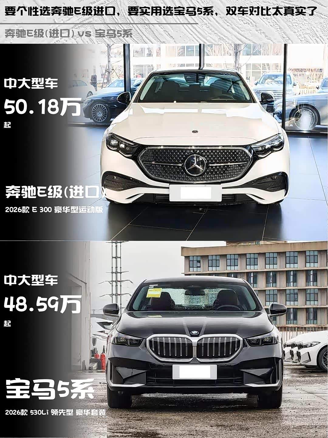 奔驰E级(进口)(参数|询价) 2026款 E 300 豪华型运动版 vs 宝马5系 2026款 530Li 领先型 豪华套装,50万级豪华轿车怎么选?🤔