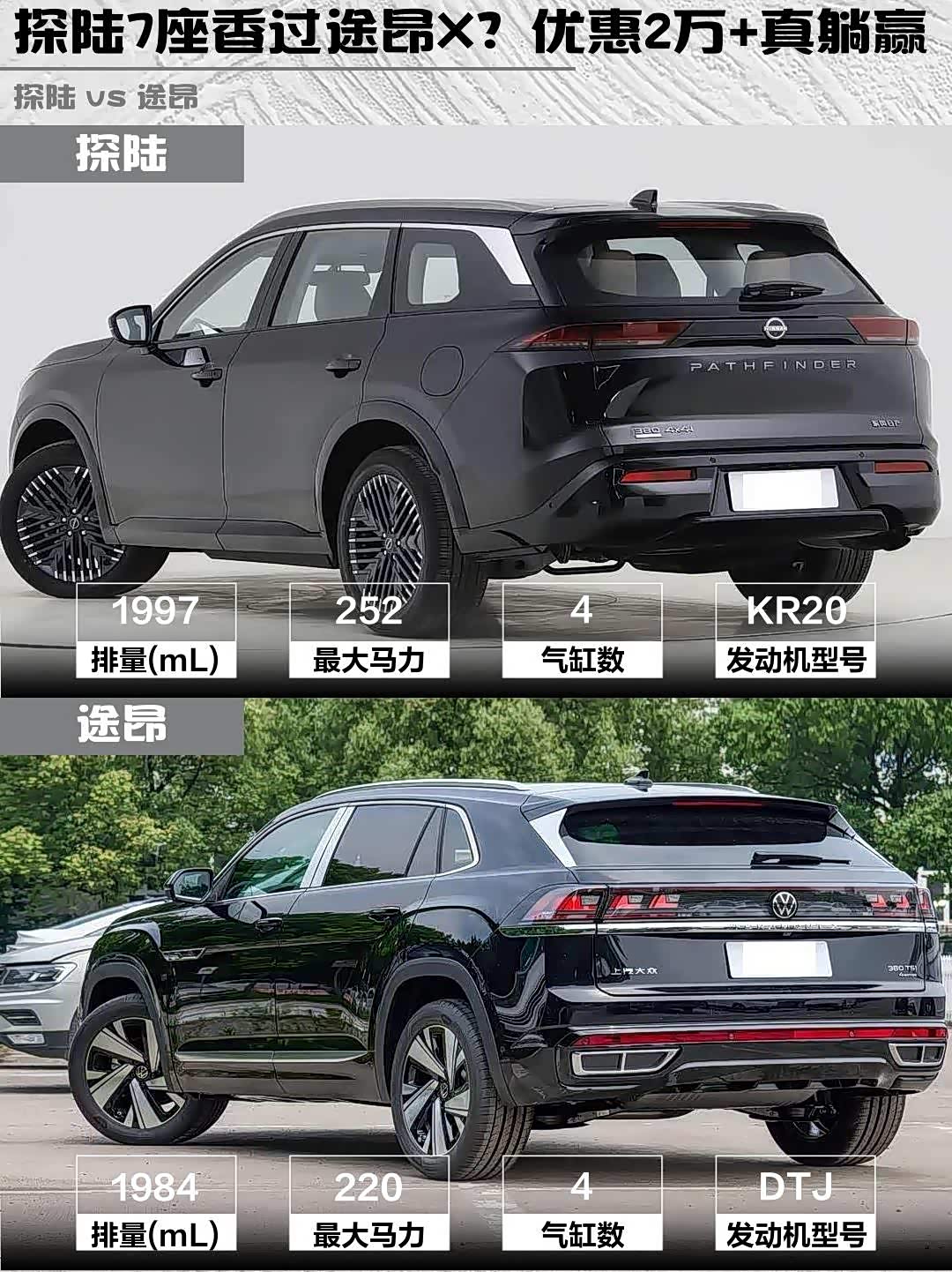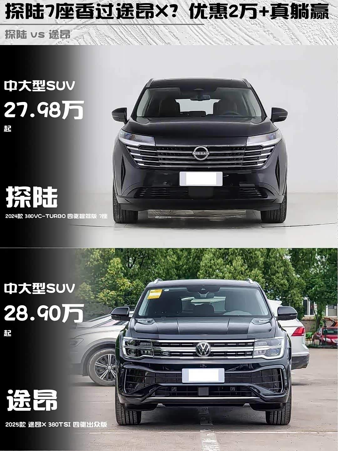 车家号·0浏览·2026-03-15 08:59 · 北京最近在纠结中大型SUV的朋友看过来!今天深度对比两款热门选手——日产探陆2024款 380VC-TURBO 四驱智驾版 7座 vs 大众途昂(参数|询价)2025款 途昂X 380TSI 四驱出众版,实测干货分享👇