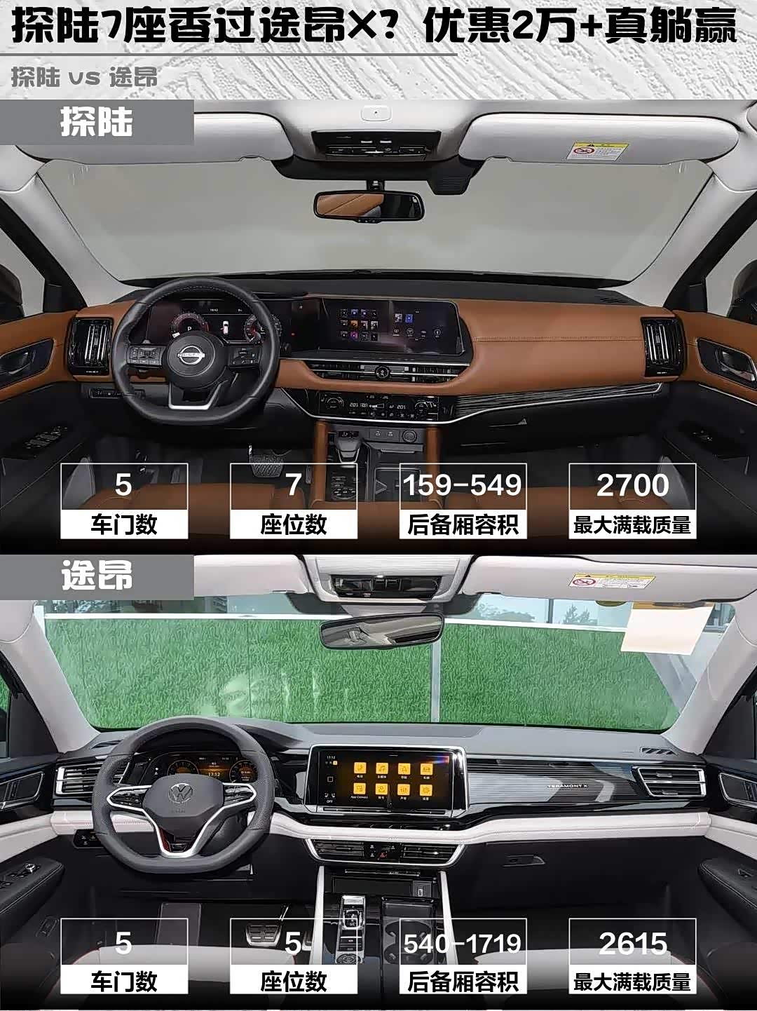 探陆5130mm车长+7座布局,第三排实测坐1.75米成人不顶腿,二排一键滑移通道超贴心!后备箱159-549L灵活组合,露营装备轻松装。途昂X虽然是5座设计,但后备箱540-1719L容积惊人,适合爱带大件行李的玩家。不过要说全家出行,探陆的Nappa真皮"大沙发"座椅+三排独立空调,舒适度确实更胜一筹💺