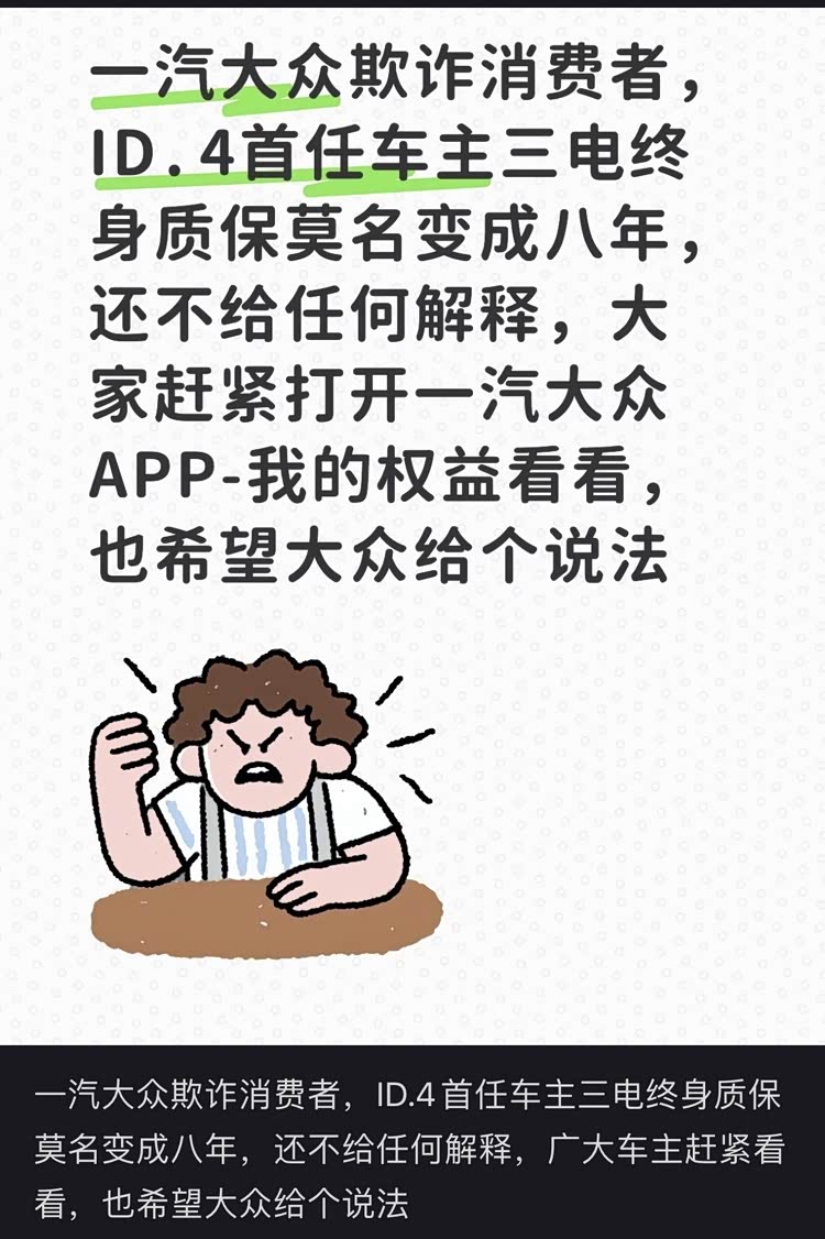 有ID.4 CROZZ车主就遭遇了权益缩水的问题,买车时,销售承诺的是三电终身质保,车主也用ID豆兑换了这项权益,但之后在品牌官方App里,这项权益却莫名“缩水”成了8年,这让车主们瞬间慌了神。