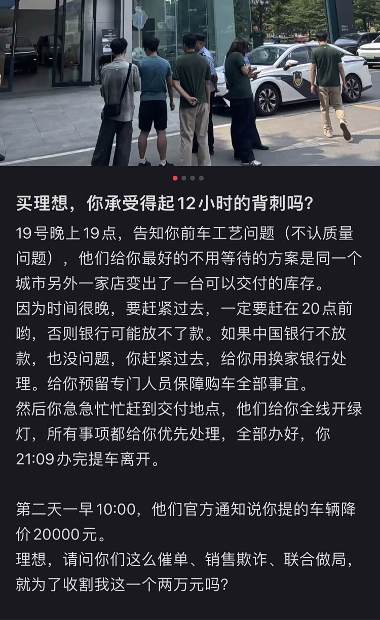 有理想L9车主分享了自己的经历,19号晚上19点,告知前车工艺问题(不认质量问题),他们给你最好的不用等待的方案是,同一个城市,另外一家店,变出了一台可以交付的库存。因为时间很晚,要赶紧过去,一定要赶在20点前哟,否则银行可能放不了款。如果中国银行不放款,也没问题,你赶紧过去,给你用换家银行处理。给你预留专门人员保障购车全部事宜。然后你急急忙忙赶到交付地点,他们给你全线开绿灯,所有事项都给你优先处理,全部办好,你21:09办完提车离开。