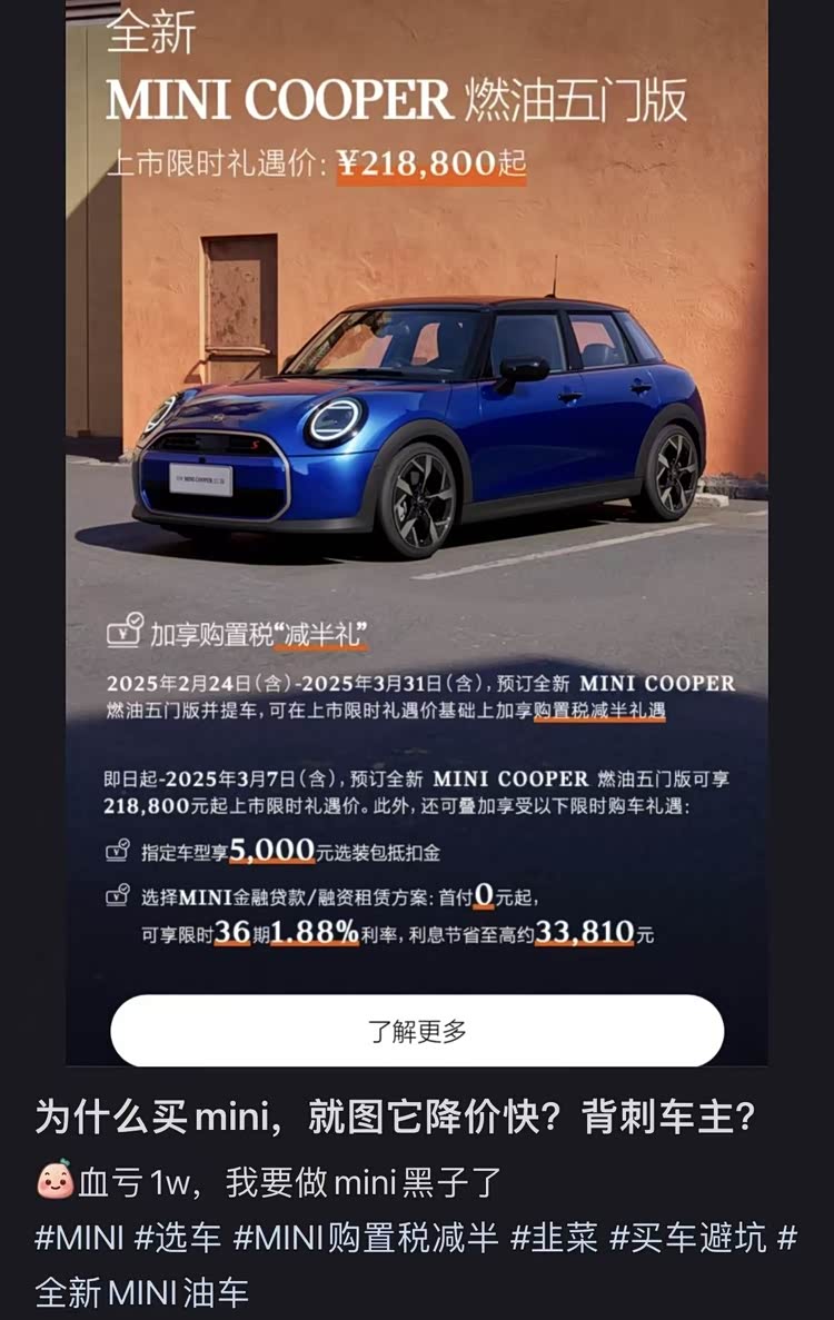 除了这位 理想L9(参数|询价)车主,特斯拉、MINI等其他品牌的车主,也曾遭遇过类似的价格背刺。如果品牌有保价政策还好,会补给车主差价,若品牌未提供保价政策,消费者往往只能自己承担差价损失。