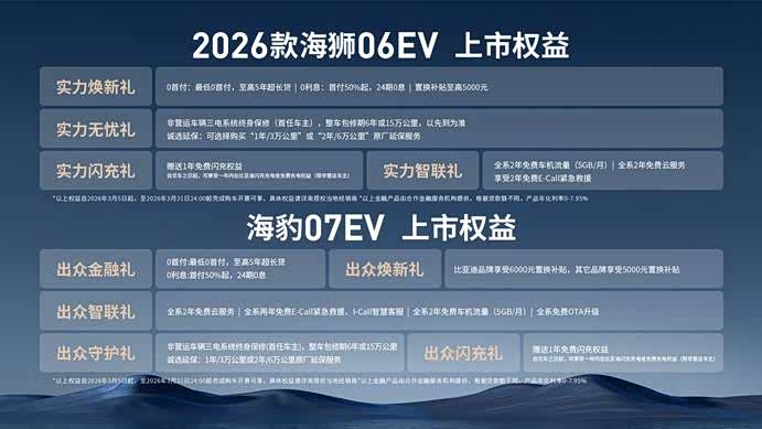 其中,2026款海狮06EV官方指导价为15.99万元-17.99万元,海豹07EV官方指导价为16.99万元-18.99万元,即日起,用户可享包括0首付、0利息、最高18个月免费闪充权益等丰厚的上市权益礼包。