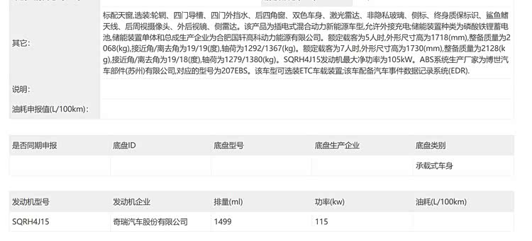 搭载1.5升汽油发动机(型号SQRH4J15),输出156马力,极速180公里/小时。申报信息未披露电池、电机及变速箱细节。轮胎规格丰富:215/55 R18、235/55 R19、245/55 R19、245/50 R20、245/50 ZR20。