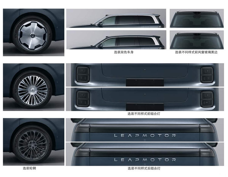 在车身尺寸方面,申报的三电机版本长宽高分别为5252mm、1995mm和1780mm,轴距达到3110mm,并标配了21英寸轮圈。此外,申报信息显示该车将提供多种个性化选装件,包括不同款式的轮圈、双色车身、前后灯组造型以及前风挡玻璃装饰条等,以满足用户的个性化需求。