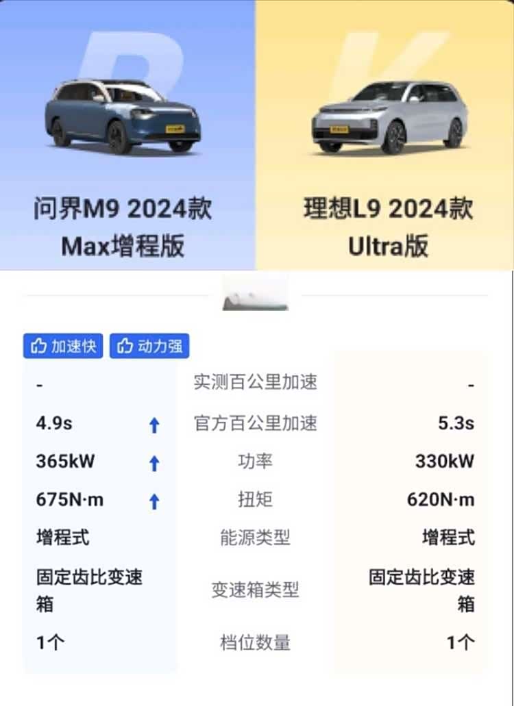 在同级别车型中,问界M9在安全性上表现卓越,同时在性能上也具备显著优势。以问界M9 Max增程版为例,其系统功率达到365KW,扭矩为675N·m,零百加速仅需4.9秒,相较之下,理想L9 Ultra版的系统功率为330KW,扭矩为620N·m,零百加速为5.3秒。此外,在能耗和充电效率方面,问界M9百公里电耗为22.2kWh,而理想L9百公里电耗稍高,为23.3kWh。问界M9的慢充时间仅需5小时即可充满电池,相较之下,理想L9需要约8个小时。值得一提的是,除了这些差异,两款车型在市场热度和销量方面也有所不同。例如,在6月份,问界M9在全国范围内的销量达到16525台,而理想L9同期销量仅为6841台。