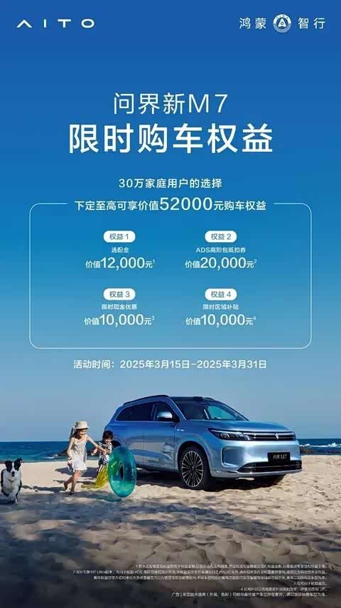 此外,问界新M7凭借强大的综合产品实力深受消费者喜爱。为回馈用户,其推出了极具吸引力的购车优惠活动。自2025年3月15日至3月31日期间,凡预定问界新M7的顾客,均可享受高达5.2万元的限时权益。