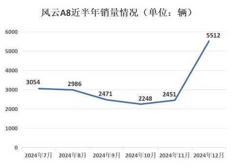 比亚迪 秦PLUS(参数|询价)一直以其7.98万起的价格吸引着消费者,使得其主要竞争者风云A8在上市后月销量长期徘徊在两千余辆。然而,风云A8在2024年12月迎来了销量翻番,达到了惊人的5512辆,创下了车型上市以来的新高。