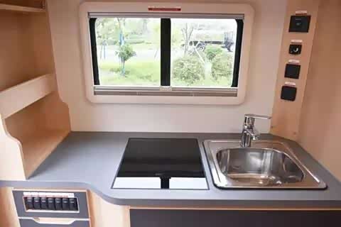车辆的尾部设计包含了厨房区和卫浴间。厨房区域以深色大理石纹理与木质元素的组合呈现,展现出简约而大气的风格。操作台面上配备了房车专用的无盖水槽和固定式水龙头,还有电磁炉和油烟机。旁边设有电源接口和调味料储物架,而台面下方的一侧则安装了电器的控制开关区域,设计十分贴心。