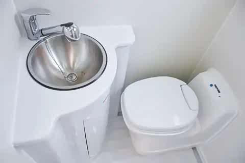 干湿一体式卫浴间配备了不锈钢面盆、可调节花洒水龙头、抽拉式马桶、晾衣架和梳妆镜等设施,全面满足用户的卫浴需求。