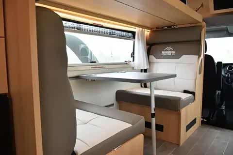 上铺旁侧巧妙地设计了窗户,确保了使用的舒适性。此外,车上还安装了宏都房车专用的顶置空调,能够精准地调节车厢内的温度。