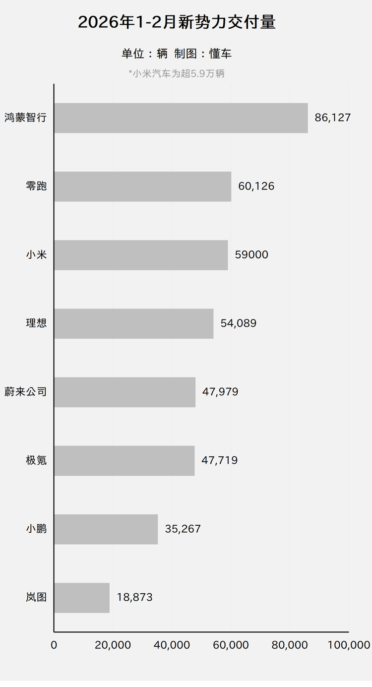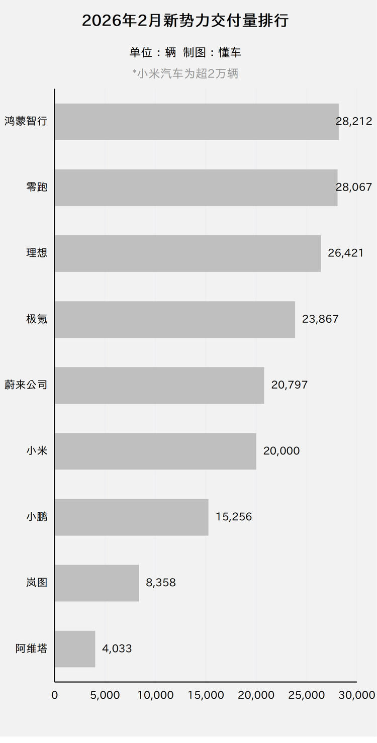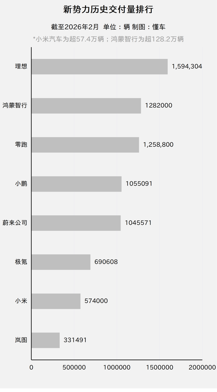 */完整的“2月新势力交付排行榜”、“1-2月新势力交付排行榜”“历史累计交付量排行榜”放在了文章最后。