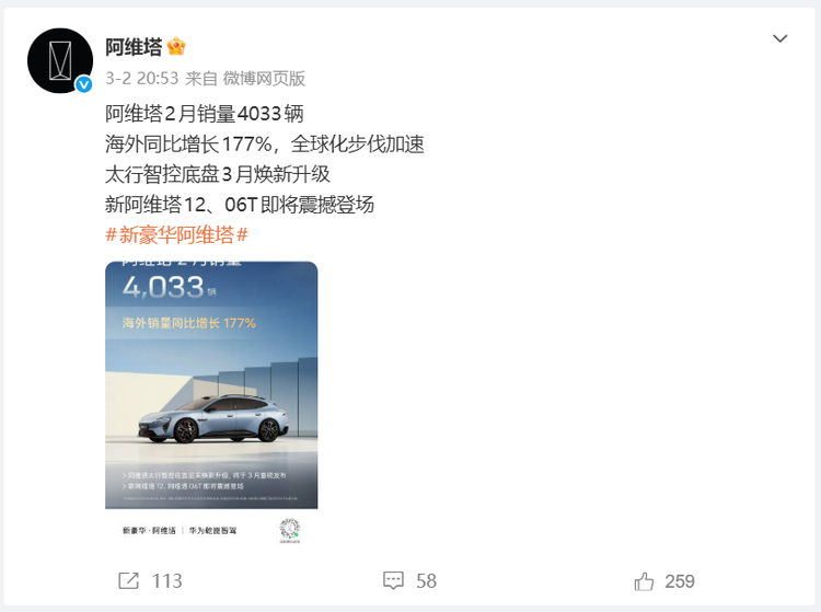 阿维塔科技虽然没公布1月交付量,但公布了2月销量为4,033辆。不过销量一般是指厂商批发给经销商的新车数量,而交付量则是指交付给用户的新车数量。