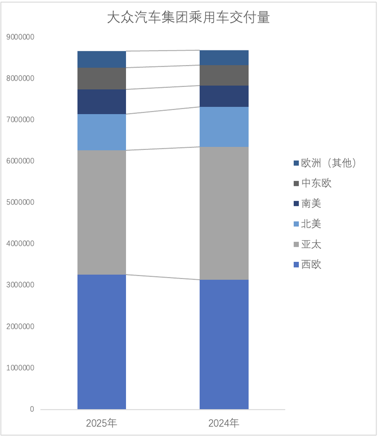 而在销售方面,3219亿欧元的销售收入,与2024年(3247亿欧元)基本持平,欧洲与南美市场销量分别增长5%和10%,有效弥补了在中国和美国市场的缺口,尤其是乘用车方面整体交付下降仅1万余辆,使得集团整体销量依然稳定在900万辆。