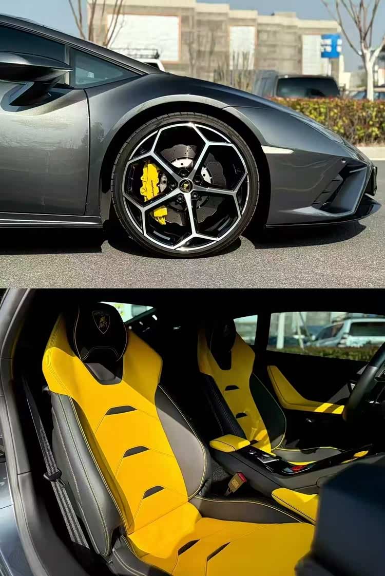 23年兰博基尼EVO,灰色外观/黑黄双拼内饰,配置:20寸锻造轮毂,黄色卡钳,底盘升降,倒车影像,头枕刺绣,电动座椅等