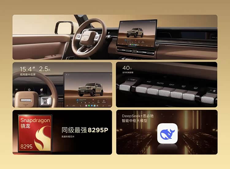 新车内饰提供三款内饰配色,15.4 英寸 2.5k 中控屏 + 8.88 英寸液晶仪表科技感满满,车机芯片是高通骁龙 8295P,同时语音助手融合AI中枢大模型 + DeepSeek,支持四音区识别,车机支持CarPlay、HiCar、CarLink手机无线互联+Switch有线投屏,满足不同用户的互联需求。